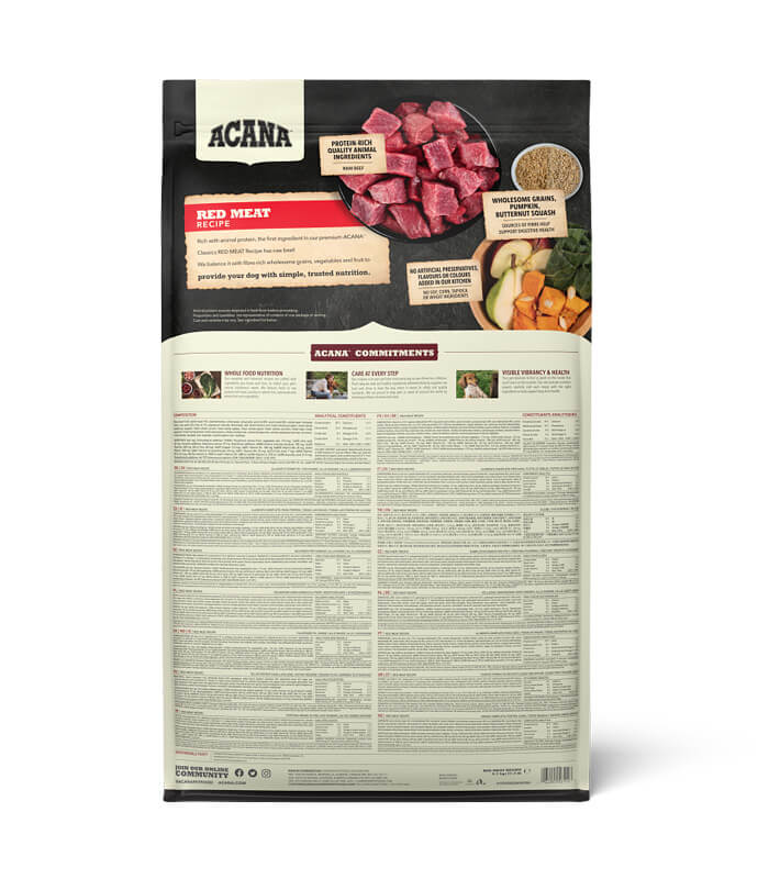 ACANA Classics Red Meat je kompletna suva hrana za pse svih rasa i uzrasta, sa govedinom, jagnjetinom i svinjetinom kao izvorima proteina. Sadrži 50% sastojaka životinjskog porekla uz dodatak celovitih žitarica, voća i povrća za uravnoteženu ishranu. Bez veštačkih boja, aroma i konzervansa.
