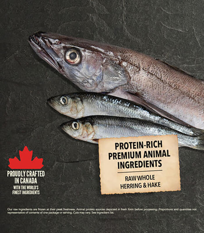 Raw salmon (22%), herring meal (19%), pearled barley, whole peas, oat groats, pork fat (8%), whole oats, chickpea fibre, fish oil (1%), calcium carbonate, potassium chloride, dried kelp, salt, dried chicory root, fresh whole pumpkin, fresh whole butternut squash, fresh whole carrots, fresh whole apples, fresh whole pears, fresh whole zucchini, fresh kale, fresh spinach, fresh turnip greens, fresh beet greens, whole cranberries, whole blueberries, whole saskatoon berries, turmeric, milk thistle, burdock root, lavender, marshmallow root, rosehips.