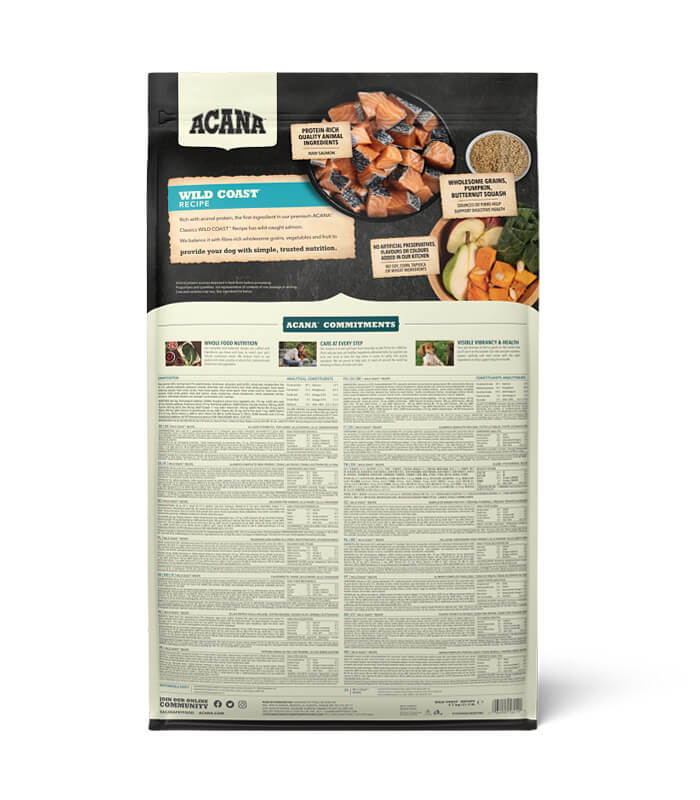 ACANA Classics Wild Coast je kompletna suva hrana za pse svih rasa i uzrasta, sa lososom i haringom kao izvorima proteina. Sadrži 50% sastojaka životinjskog porekla uz dodatak celovitih žitarica, voća i povrća za uravnoteženu ishranu. Bez veštačkih boja, aroma i konzervansa.