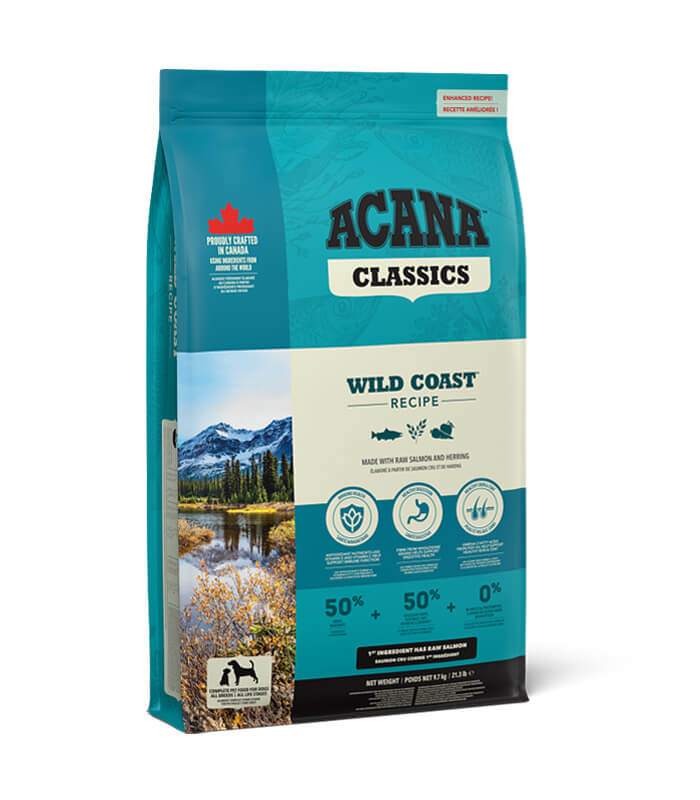 ACANA Classics Wild Coast je kompletna suva hrana za pse svih rasa i uzrasta, formulisana sa lososom i haringom kao glavnim izvorima proteina. Receptura sadrži 50% sastojaka životinjskog porekla uz dodatak celovitih žitarica, voća, povrća i biljnih komponenti, čime obezbeđuje uravnotežen nutritivni profil za svakodnevnu ishranu.