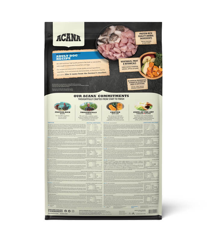 ACANA Heritage Adult Dog je kompletna suva hrana za odrasle pse svih rasa, formulisana sa visokim udelom životinjskih sastojaka uključujući piletinu, ribu i jaja. Receptura sadrži 60% sastojaka životinjskog porekla i razvijena je bez dodatka žitarica, uz pažljivo odabrane sastojke koji obezbeđuju uravnotežen nutritivni profil za svakodnevnu ishranu.