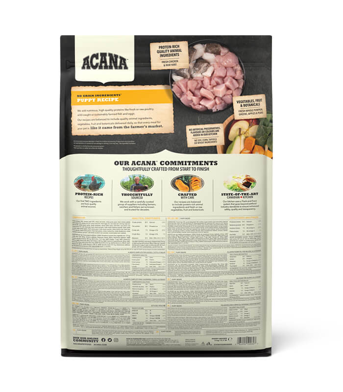ACANA Heritage Puppy je kompletna suva hrana za štence, formulisana sa visokim udelom životinjskih sastojaka uključujući piletinu, ribu i jaja. Receptura sadrži 70% sastojaka životinjskog porekla i razvijena je bez dodatka žitarica, uz pažljivo odabrane sastojke koji obezbeđuju uravnotežen nutritivni profil tokom faze rasta.