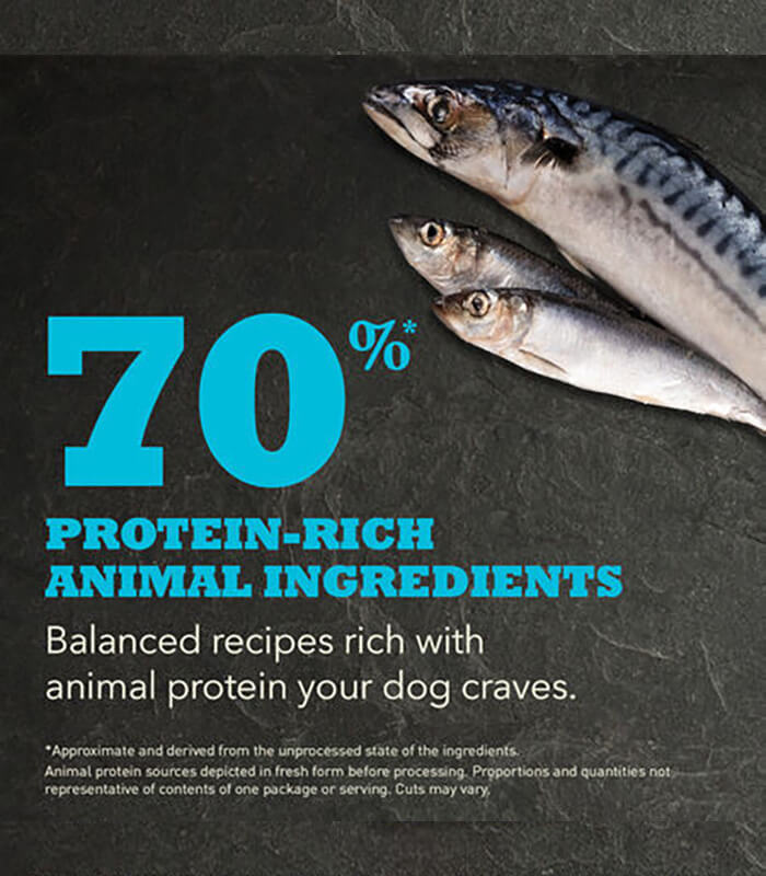 Raw whole herring (14%), raw whole mackerel (11%), raw flounder (9%), herring meal (7%), mackerel meal (7%), blue whiting meal (7%), whole green peas, whole red lentils, whole chickpeas, whole green lentils, fish oil (6%), raw whole hake (4.5%), raw whole rockfish (4.5%), whole pinto beans, whole yellow peas, pea starch, sunflower oil, lentil fiber, dried kelp, freeze-dried cod and liver, fresh whole pumpkin, fresh whole butternut squash, fresh whole carrots, fresh whole apples, fresh whole pears, fresh whole zucchini, dried chicory root, fresh kale, fresh spinach, fresh turnip greens, fresh beet greens, whole cranberries, whole blueberries, whole saskatoon berries, turmeric, milk thistle, burdock root, lavender, marshmallow root, rosehips.