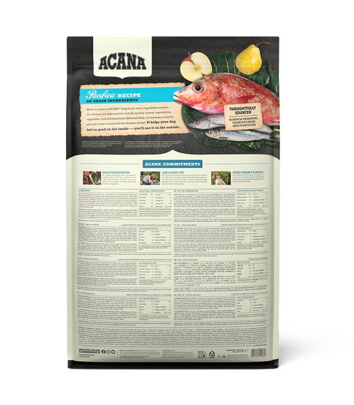 ACANA Regionals Pacifica je kompletna suva hrana za pse svih rasa i uzrasta, formulisana sa visokim udelom životinjskih sastojaka iz ribe uključujući haringu, skušu, iverak i druge vrste morske i slatkovodne ribe. Receptura sadrži 70% sastojaka životinjskog porekla i razvijena je bez dodatka žitarica, uz raznovrsne izvore proteina koji obezbeđuju uravnotežen nutritivni profil za svakodnevnu ishranu.