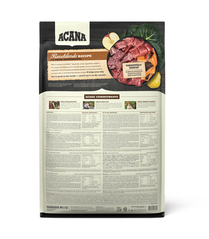 ACANA Regionals Ranchlands je kompletna suva hrana za pse svih rasa i uzrasta, sa govedinom, jagnjetinom i svinjetinom kao izvorima proteina. Sadrži 70% sastojaka životinjskog porekla i formulisana je bez žitarica za uravnoteženu ishranu. Bez veštačkih boja, aroma i konzervansa.