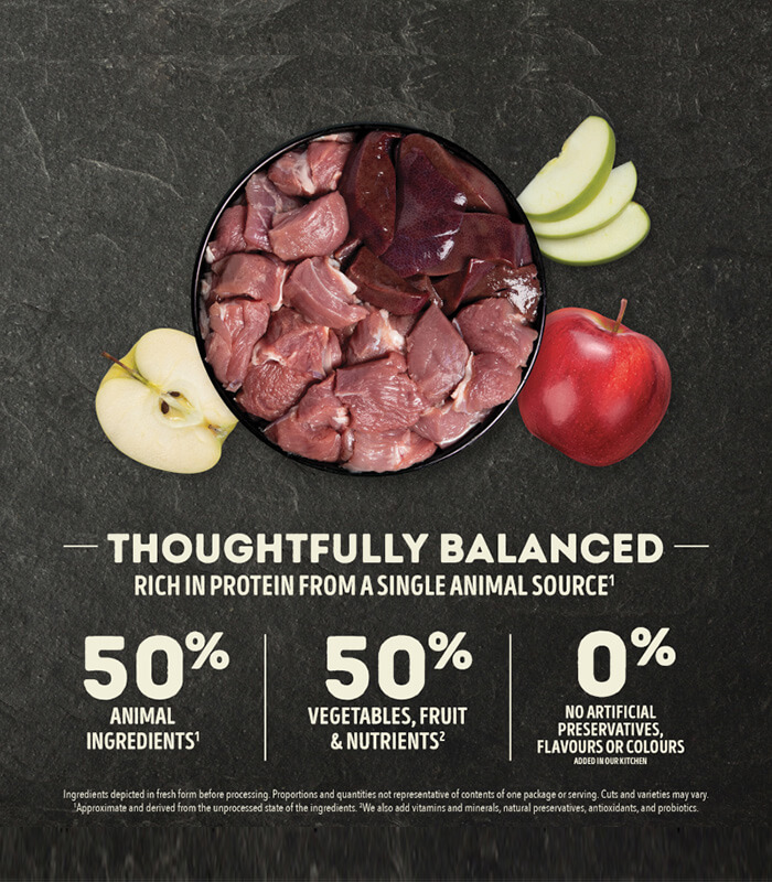 Raw grass-fed lamb (18%), lamb meal (18%), whole green peas, whole red lentils, raw lamb liver (4%), lamb fat (4%), fresh red delicious apples (4%), whole chickpeas, whole green lentils, whole yellow peas, raw lamb tripe (2%), raw lamb kidney (2%), dried lamb cartilage (2%), lentil fiber, marine algae (1.2%), fresh whole butternut squash, fresh whole pumpkin, dried brown kelp, salt, freeze-dried lamb liver (0.1%), fresh whole cranberries, fresh whole blueberries, chicory root, turmeric root, milk thistle, burdock root, lavender, marshmallow root, rosehips.