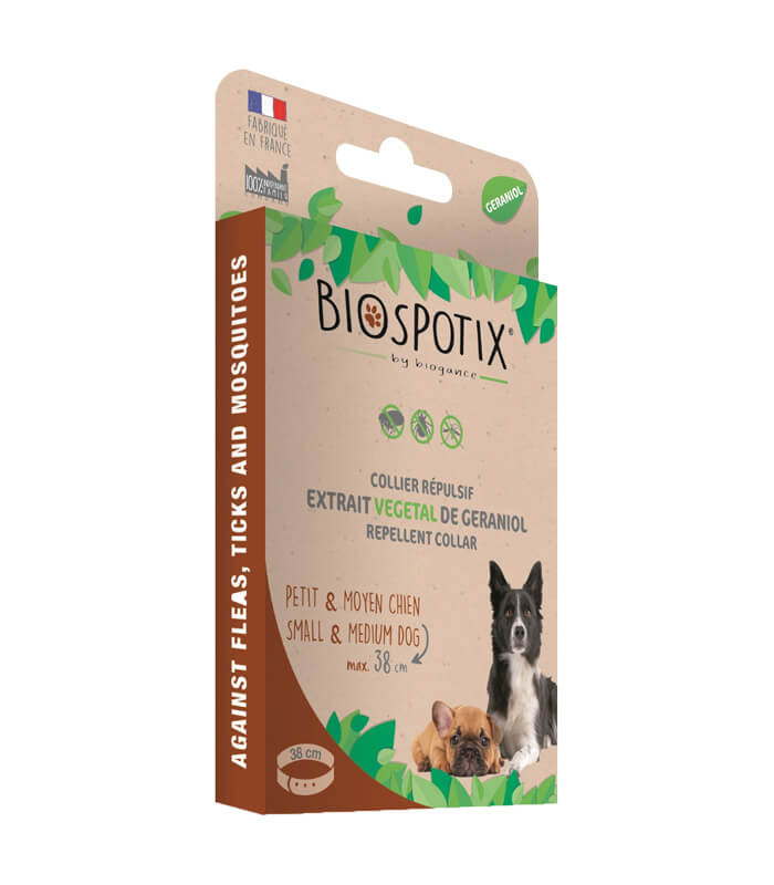 BIOGANCE Biospotix ogrlica za male i srednje pse protiv buva, krpelja i komaraca je biljna antiparazitska ogrlica namenjena psima manjih i srednjih rasa. Formulisana je na bazi biljnog ekstrakta geraniola i deluje repelentno, stvarajući neprijatno okruženje za spoljašnje parazite, bez upotrebe insekticida i sintetičkih pesticida. Proizvod nije veterinarski lek i namenjen je preventivnoj upotrebi.