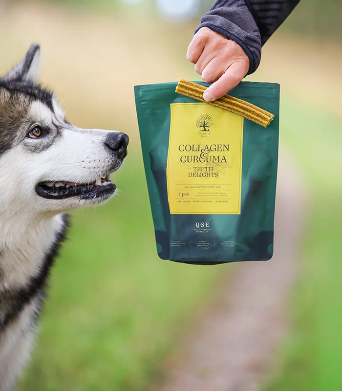 ESSENTIAL FOODS Collagen & Curcuma Teeth Delights su dentalne poslastice za pse namenjene svakodnevnoj oralnoj higijeni. Zvezdasti oblik i poluvlažna tekstura doprinose mehaničkom čišćenju zuba tokom žvakanja, dok dodatak natrijum heksametafosfata (SHMP) pomaže u sprečavanju stvaranja plaka.