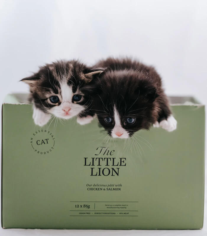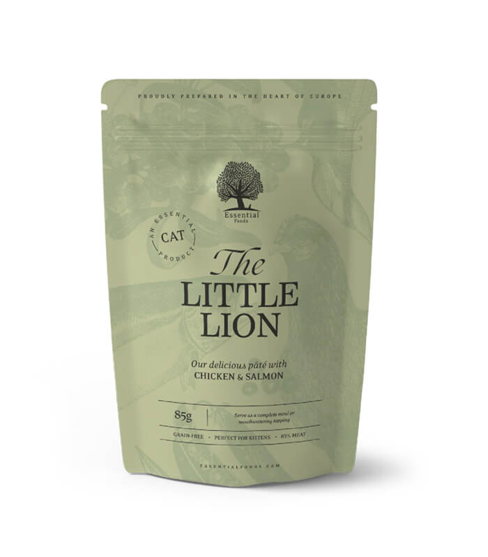 ESSENTIAL FOODS The Little Lion Pâté je kompletna vlažna hrana za mačiće, pripremljena od fileta piletine i lososa u bogatom sosu. Receptura bez žitarica prilagođena je potrebama mačića i može se koristiti kao kompletan obrok ili kao ukusan preliv preko suve hrane.