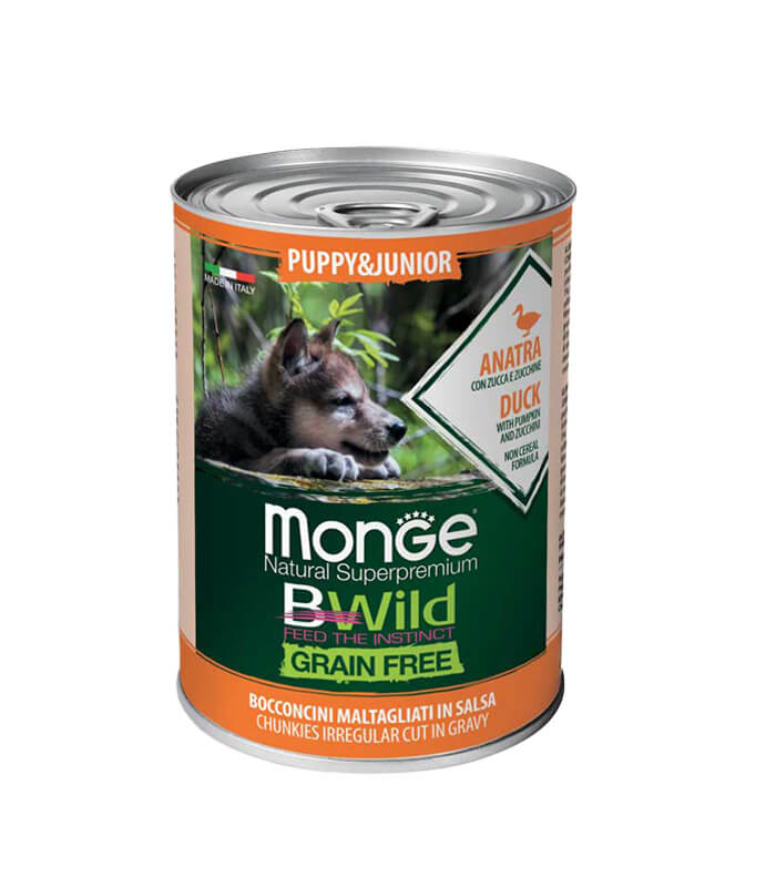 MONGE BWild Grain Free Puppy & Junior Dog Duck – vlažna hrana sa pačetinom, bundevom i tikvicama (400g)