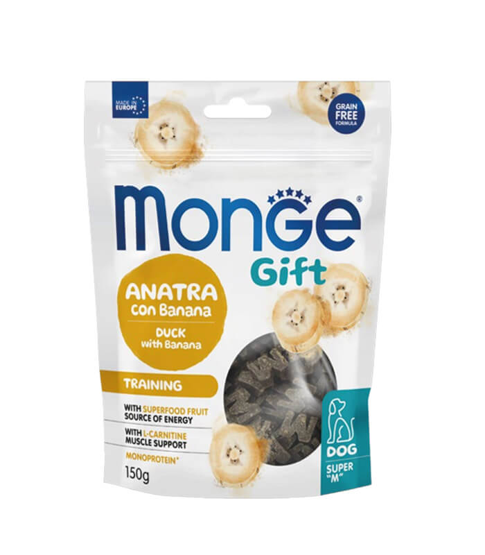MONGE Gift Training Dog Duck with Banana Super “M” (150g) je komplementarna funkcionalna poslastica za odrasle pse, razvijena za nagrađivanje tokom treninga. Grain free receptura sadrži 50% sušene patke kao jedini izvor životinjskog proteina, visoke biološke vrednosti. Formulacija je obogaćena L-karnitinom (100 mg/kg) za održavanje nemasne mase i energijom prilagođenom fizičkoj aktivnosti. Dodatak sušene banane (1%) doprinosi unosu minerala korisnih tokom povećane aktivnosti. Bez dodatih veštačkih boja i šećera.