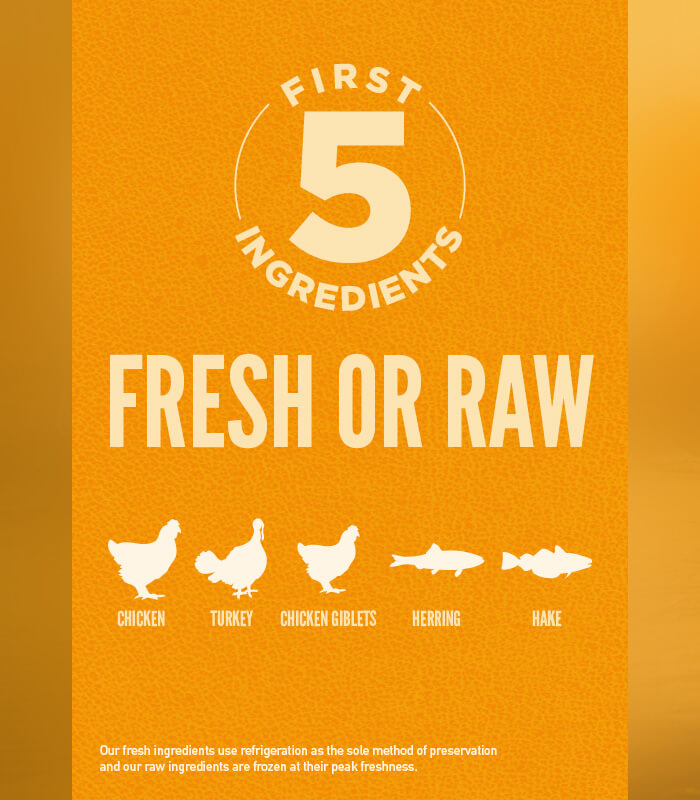 Fresh chicken (23%), raw turkey (10%), fresh chicken giblets (liver, heart) (8%), raw whole herring (6%), raw whole hake (5%), fresh eggs (5%), dehydrated chicken (4%), dehydrated turkey (4%), dehydrated mackerel (4%), dehydrated sardine (4%), dehydrated herring (4%), chicken fat (4%), whole red lentils, whole peas, whole green lentils, whole chickpeas, lentil fibre, whole pinto beans, whole navy beans, raw turkey liver (2%), pollock oil (2%), pea starch, dried kelp, fresh whole pumpkin, fresh whole butternut squash, fresh whole zucchini, fresh whole carrots, fresh whole apples, fresh whole pears, dried chicory root, fresh kale, fresh spinach, fresh beet greens, fresh turnip greens, whole cranberries, whole blueberries, whole saskatoon berries, turmeric, milk thistle, burdock root, lavender, marshmallow root, rosehips.