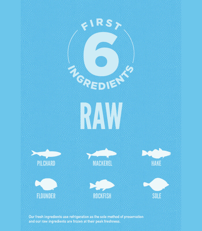 Raw whole pilchard (18%), raw whole mackerel (11%), raw whole hake (10%), raw flounder (6%), raw whole rockfish (6%), raw whole sole (6%), dehydrated mackerel (5%), dehydrated herring (5%), dehydrated whitefish (5%), dehydrated sardine (5%), dehydrated blue whiting (4%), herring oil (4%), whole red lentils, whole peas, whole chickpeas, whole green lentils, lentil fibre, whole pinto beans, pea starch, sunflower oil, dried kelp, fresh whole pumpkin, fresh whole butternut squash, fresh whole zucchini, fresh whole carrots, fresh whole apples, fresh whole pears, dried chicory root, fresh kale, fresh spinach, fresh beet greens, fresh turnip greens, whole cranberries, whole blueberries, whole saskatoon berries, turmeric, milk thistle, burdock root, lavender, marshmallow root, rosehip.