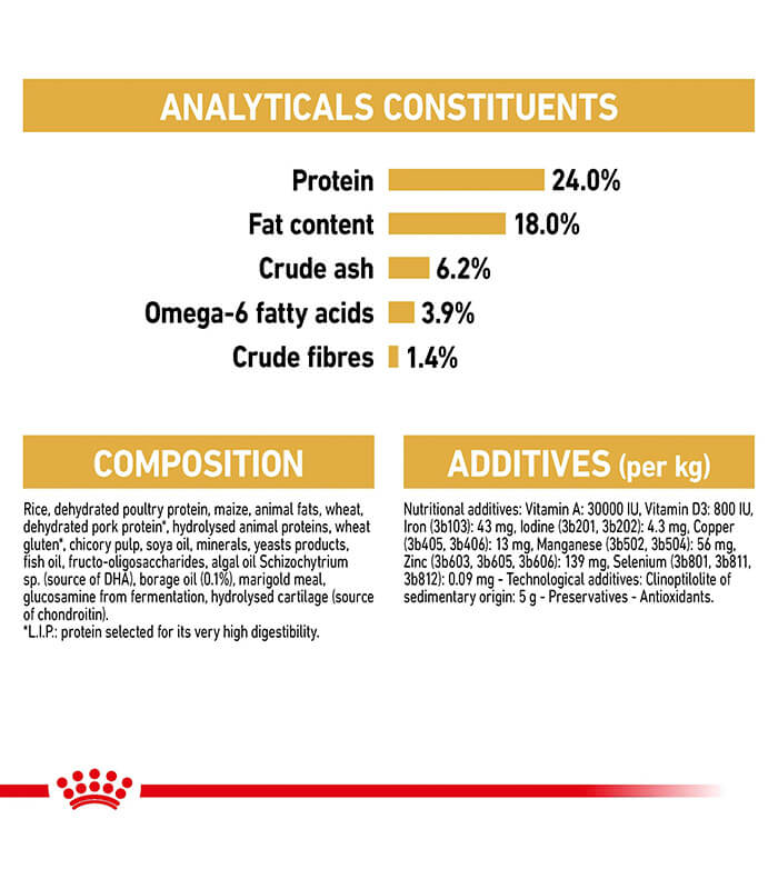 kukuruz, pirinač, dehidrirani proteini živine, životinjske masti, hidrolizovani proteini životinjskog porekla, dehidrirani proteini svinjetine, kukuruzno brašno, biljni proteinski izolati*, pulpa cikorije, sojino ulje, riblje ulje, kvasci i njihovi derivati, minerali, frukto-oligosaharidi, ulje boražine (0.1%), ekstrakt nevena (izvor luteina), hidrolizovani rakovi (izvor glukozamina), hidrolizovana hrskavica (izvor hondroitina).