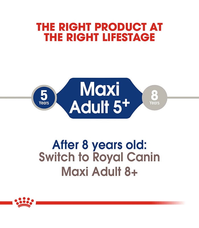 ROYAL CANIN Maxi Adult 5+ je kompletna hrana namenjena zrelim psima velikih rasa (26–44 kg) starijim od 5 godina.
