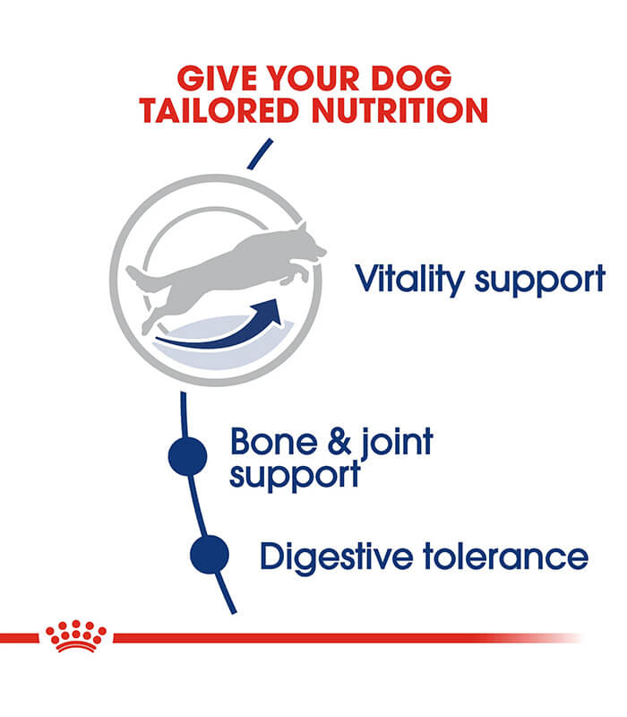 Formulacija je prilagođena prvim znacima starenja kod velikih rasa pasa, sa fokusom na održavanje vitalnosti, metabolizma i zdravlja zglobova.