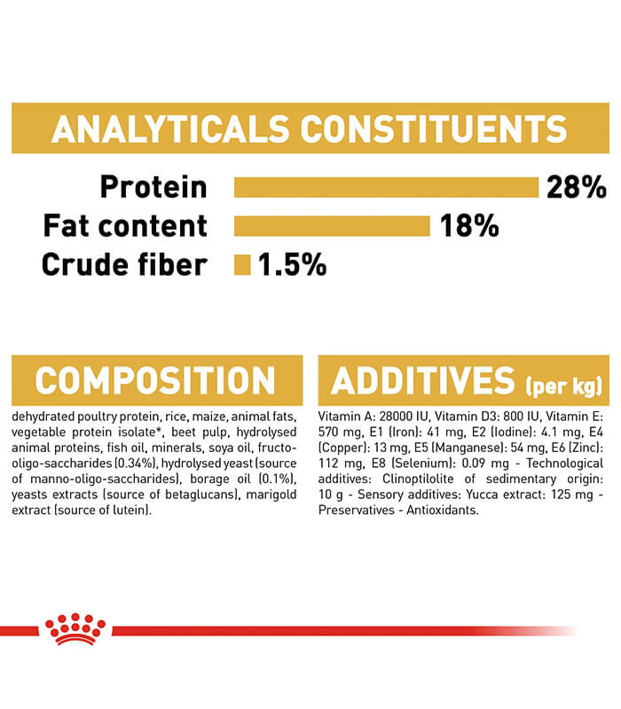 dehidrirani proteini živine, pirinač, kukuruz, životinjske masti, biljni proteinski izolati*, repina pulpa, hidrolizovani proteini životinjskog porekla, riblje ulje, minerali, sojino ulje, frukto-oligosaharidi (0.34%), hidrolizovani kvasac (izvor manano-oligosaharida), ulje boražine (0.1%), ekstrakti kvasca (izvor beta-glukana), ekstrakt nevena (izvor luteina).