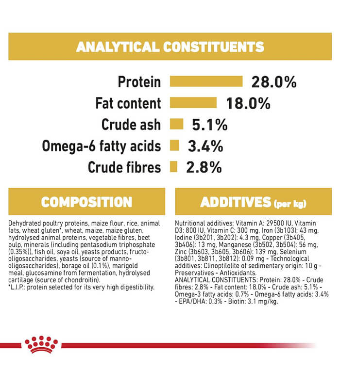 dehidrirani proteini živine, pšenični gluten*, pirinač, životinjske masti, kukuruz, kukuruzni gluten, hidrolizovani proteini životinjskog porekla, biljna vlakna, repina pulpa, minerali (uključujući pentanatrijum trifosfat (0.35%)), riblje ulje, sojino ulje, proizvodi kvasca, sušena pulpa paradajza (izvor likopena), frukto-oligosaharidi, kvasci (izvor manano-oligosaharida), ulje boražine (0.1%), glukozamin iz fermentacije, brašno nevena, hidrolizovana hrskavica (izvor hondroitina).