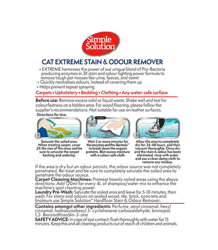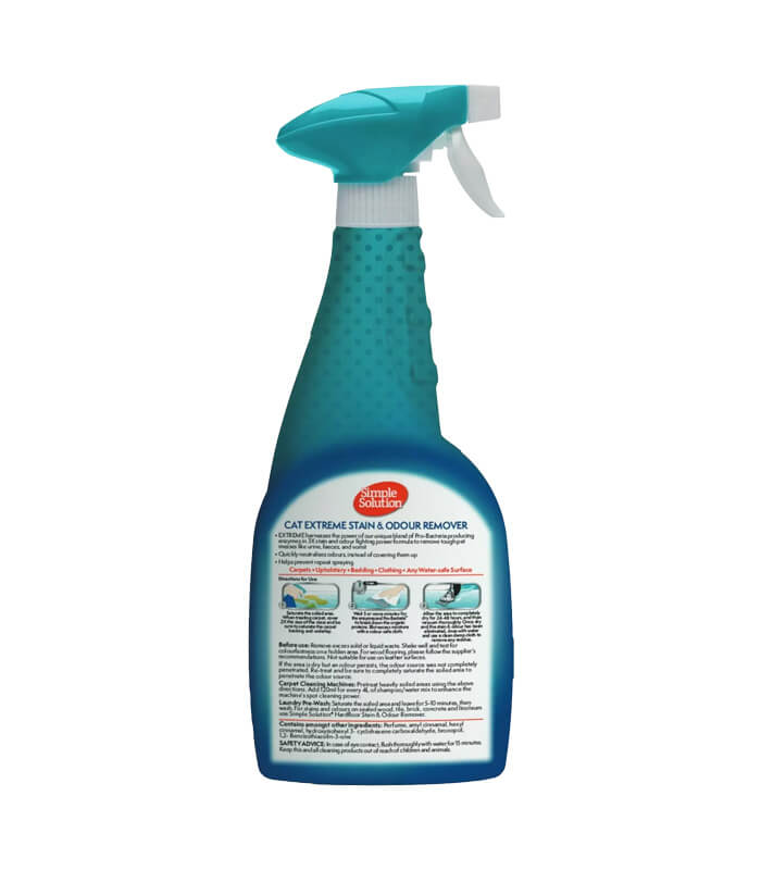 Simple Solution Extreme Stain & Odour Remover Cat je enzimski čistač (sprej) za uklanjanje tvrdokornih mrlja i neprijatnih mirisa kod mačaka. Sa 3X Pro-Bacteria™ formulom razlaže organske nečistoće i pomaže u sprečavanju ponovnog obeležavanja. Pogodan za tepihe, nameštaj i druge vodootporne površine.