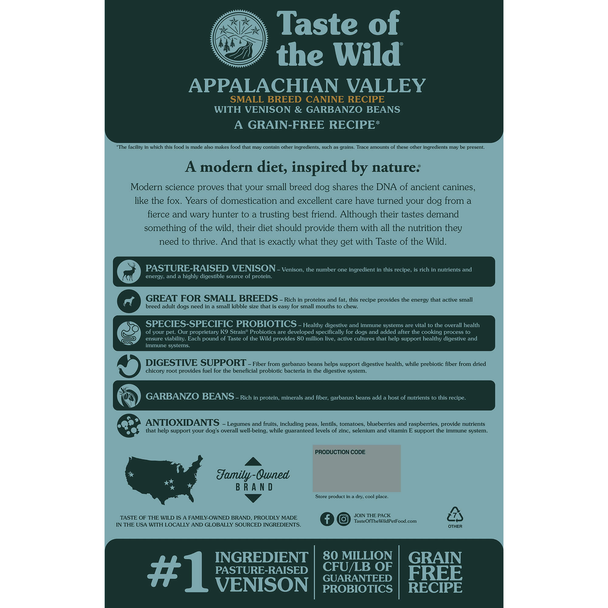 Taste of the Wild Appalachian Valley Small Breed Canine Recipe with Venison & Garbanzo Beans je grain-free suva hrana za odrasle pse malih rasa. Receptura koristi srnetinu kao prvi sastojak, uz leblebije i prebiotička vlakna, kao i dodatak K9 Strain® probiotika.