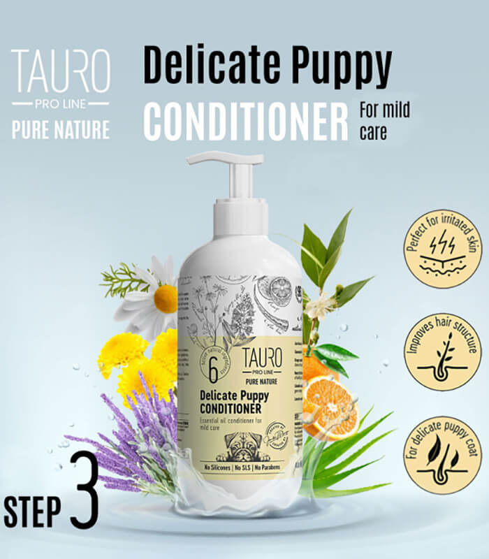 TAURO – Pure Nature Delicate Puppy Conditioner – gentle coat je izuzetno blagi regenerator za štence, razvijen za završnu negu osetljive kože i nežne dlake u ranoj fazi života. Formulisan je sa visokim udelom prirodnih sastojaka i etarskih ulja, sa ciljem jačanja strukture dlake, smirivanja kože i očuvanja prirodne ravnoteže vlažnosti.