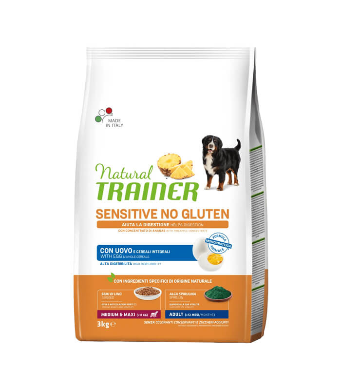 TRAINER Specialty Nutrition Sensitive Monoproteico Medium & Maxi Adult with Egg je kompletna i balansirana suva hrana namenjena odraslim psima srednjih i velikih rasa (preko 11 kg telesne mase), starijim od 1 godine. Receptura je razvijena sa jednim deklarisanim životinjskim proteinom – jajetom, uz pažljivo odabrane sastojke prirodnog porekla, sa ciljem podrške varenju i ishrane pasa sa osetljivim digestivnim sistemom.