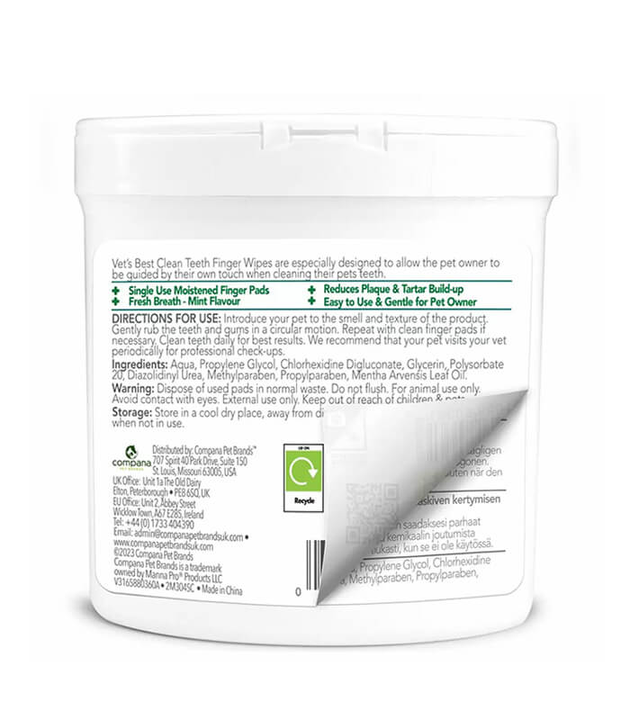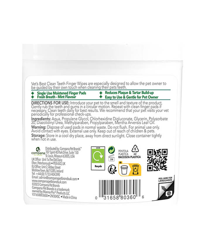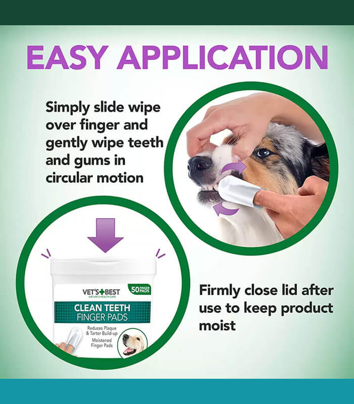 VET’S BEST Clean Teeth Finger Pads (50 kom) su vlažne maramice za zube za pse koje se navlače na prst i omogućavaju jednostavno održavanje oralne higijene bez potrebe za četkicom ili pastom. Predstavljaju praktičnu alternativu klasičnom pranju zuba.