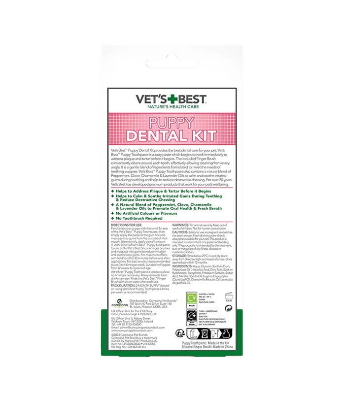 VET’S BEST Dental Care Kit for Puppies – Finger Brush and toothpaste je komplet za održavanje oralne higijene štenaca, razvijen sa ciljem da podrži negu zuba i desni u periodu rasta i zubanja. Set sadrži silikonsku četkicu za prst i pastu za zube sa pažljivo odabranim sastojcima, prilagođenim osetljivim desnima mladih pasa.