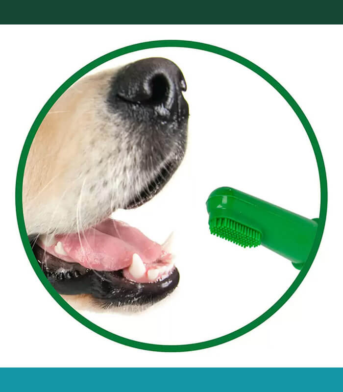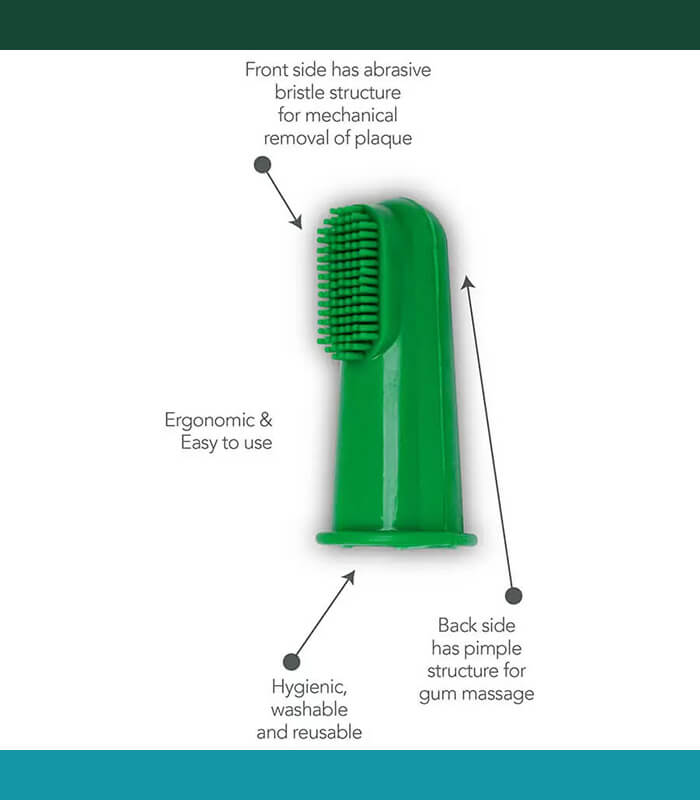 Komplet za dentalnu higijenu štenaca sa silikonskom četkicom za prst i pastom za zube. Namenjen nezi zuba i desni tokom perioda rasta i zubanja.